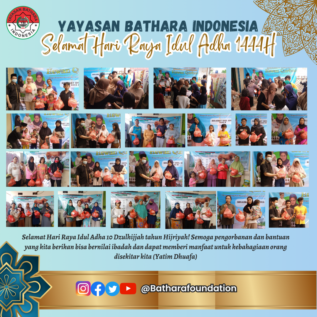 Dengan begitu Yayasan Bathara Indonesia ikut serta dalam merayakan hari raya idul adha dengan berbagi daging Qurban dengan menyembelih 2 ekor sapi dan 7 ekor kambing yang tentunya cukup untuk yatim dan dhuafa wilayah Yayasan.